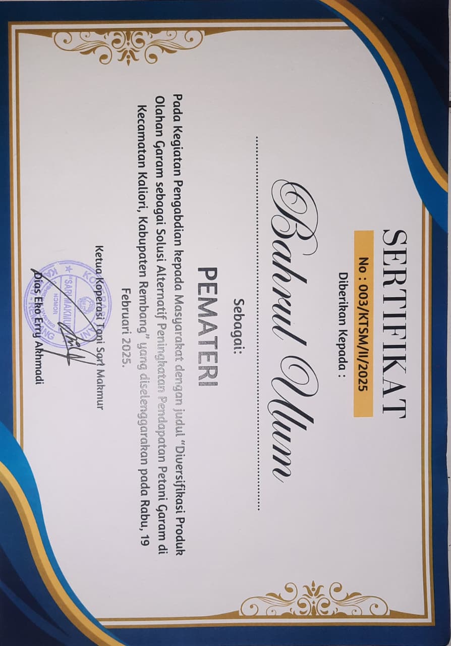 ULUM, BAHRUL Sertifikat pembicara kegiatan pengabdian garam 2025. [Teaching Resource]